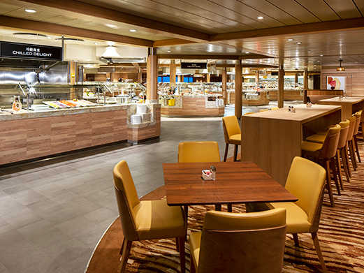 帆船自助餐厅是皇家加勒比游轮的标志性餐厅,在这里可以全天候享用寰宇美食。从西式的汉堡薯条、墨西哥薄饼到中式的热炒细点,更有丰富的时鲜水果和甜品糕点,不同时段更换的菜品满足您全天不间断的美食需求。