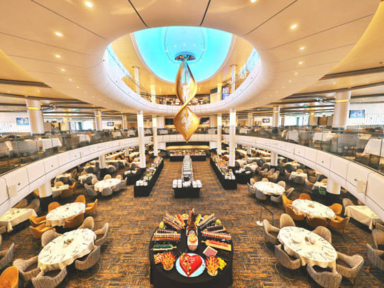 海洋光谱号拥有3层挑高、可容纳1884人的盛宴式免费主餐厅。行程中每天提供不同的菜单,可供宾客单点环球美食,自由选择分餐或与家庭分享。