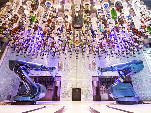 充满科技元素奇趣无穷的机器人酒吧拥有两台机器人手臂,它们可以创造无数的调制组合,从经典到定制,从含酒精鸡尾酒到无酒精饮料,满足您的各式需求。只需在平板上下达指令,它们就会用流畅的动作为您调制属于自己的精彩特饮。